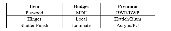 - Different material brands (plywood, laminate, hardware)