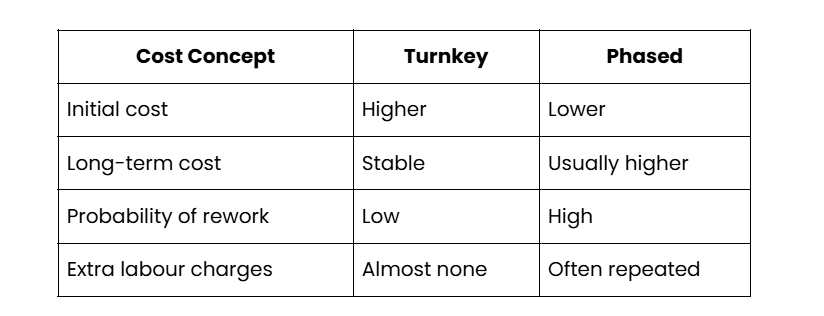 Turnkey costs more upfront, but phased interiors often end up costing more due to rework, delays, and separate vendor charges.